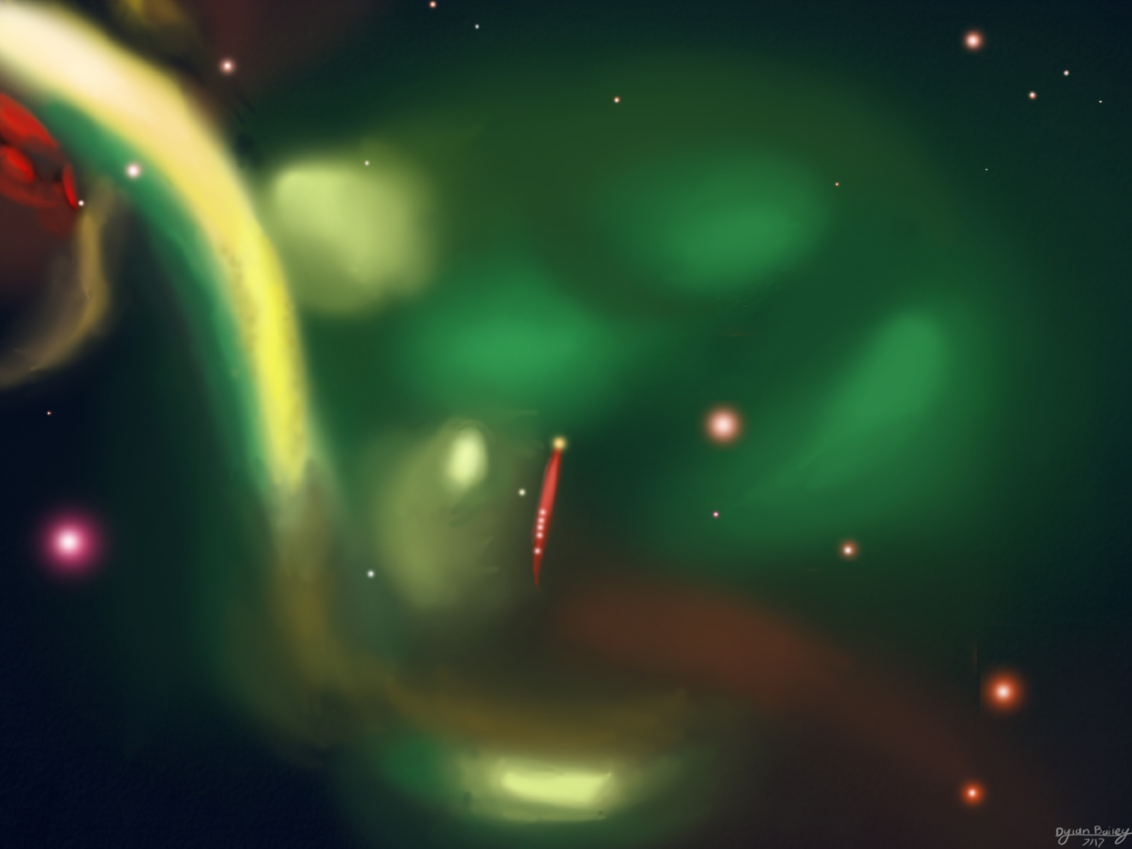 A digital painting inspired by pictures of the Red Rectangle Nebula. The Red Rectangle Nebula (also known as HD 44179) is a is a proto-planetary nebula located roughly 2300 light years from Earth. It shines with reflected light as its central star is not hot enough to ionize the gas being shed.